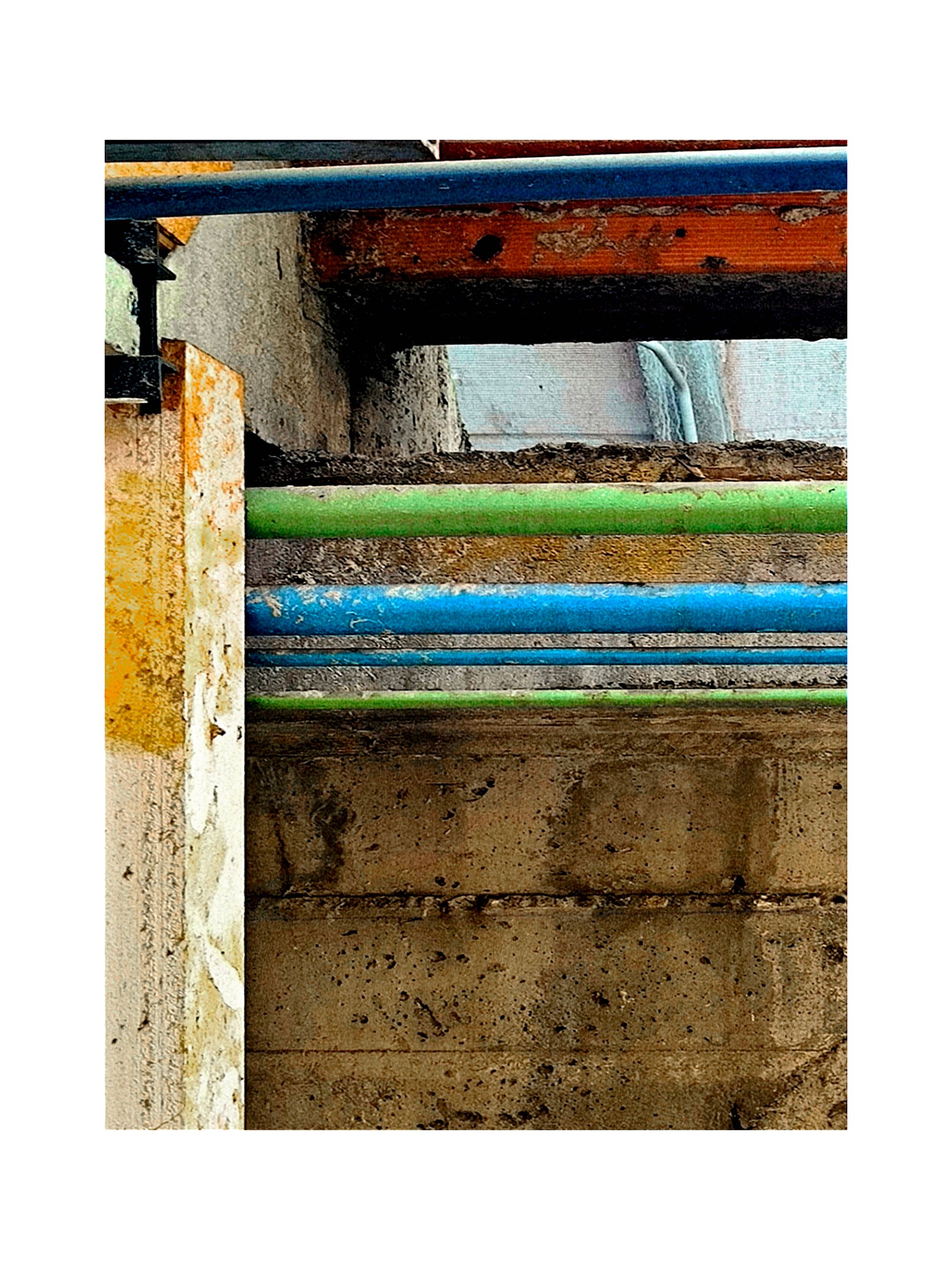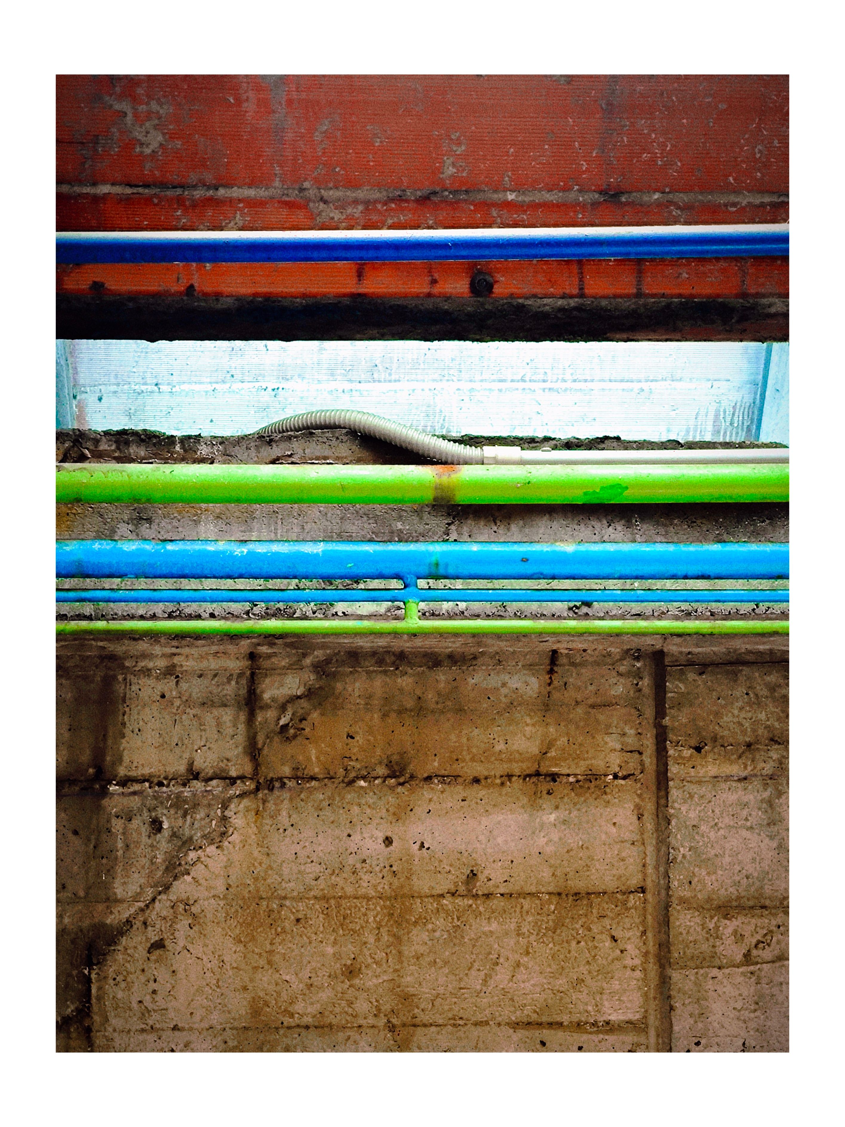 Muro di un’azienda manifatturiera italiana tipo, che racconta la storia di come dietro le belle facciate esterne si nasconde sempre uno scheletro fatto di crepe e rattoppi e tubi colorati.