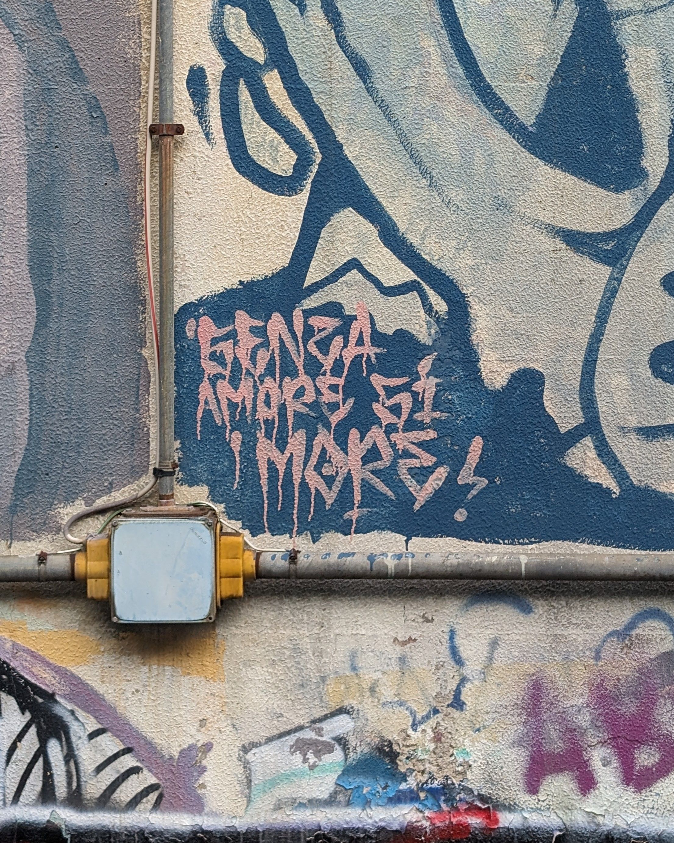 L'edificio è un ex spazio sociale occupato con biblioteca e attività culturali. È stato sgomberato ad agosto 2023. Ho decine di foto di questa parete, ogni volta che passo da qui è più forte di me, non riesco a non fotografarla.